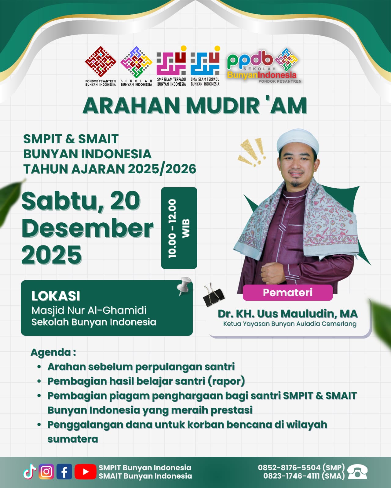 Pada hari Sabtu, 20 Desember 2025, SMPIT dan SMAIT Bunyan Indonesia menyelenggarakan kegiatan Pengambilan Laporan Hasil Evaluasi Belajar Semester Ganjil Tahun Pelajaran 2025/2026 yang dirangkaikan den...